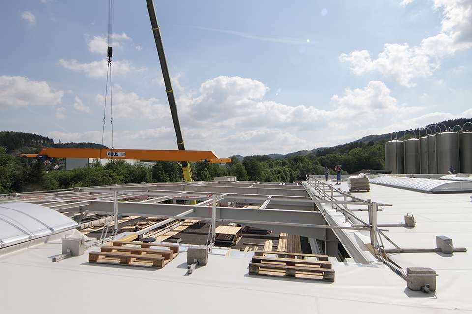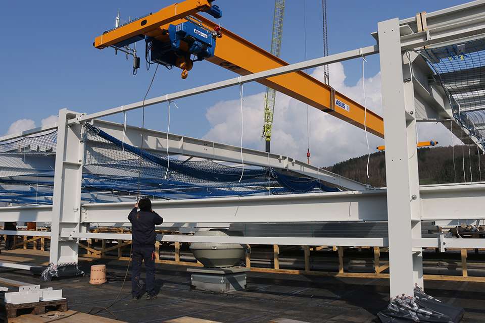 起重機通常會安裝在已完工的工廠中。因此,在建筑施工階段安裝橋式起重機是一個非同尋常的項目。這發(fā)生于專業(yè)從事包裝業(yè)務的Jokey Plaik公司。該司安裝了安博橋式起重機,起初用于幫助在現(xiàn)有的生產(chǎn)廠房上增建一層。